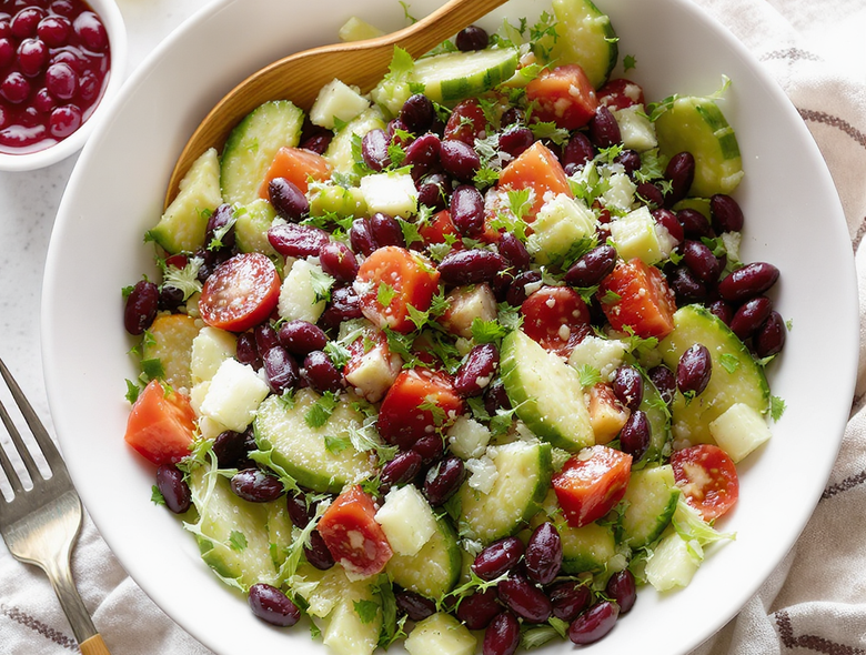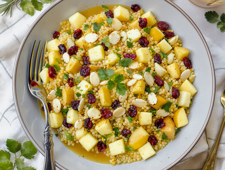Large pearls of Israeli couscous mixed with herbs come together quickly into a hearty salad with apples, dried cranberries, toasted almonds and a maple-apple vinaigrette.