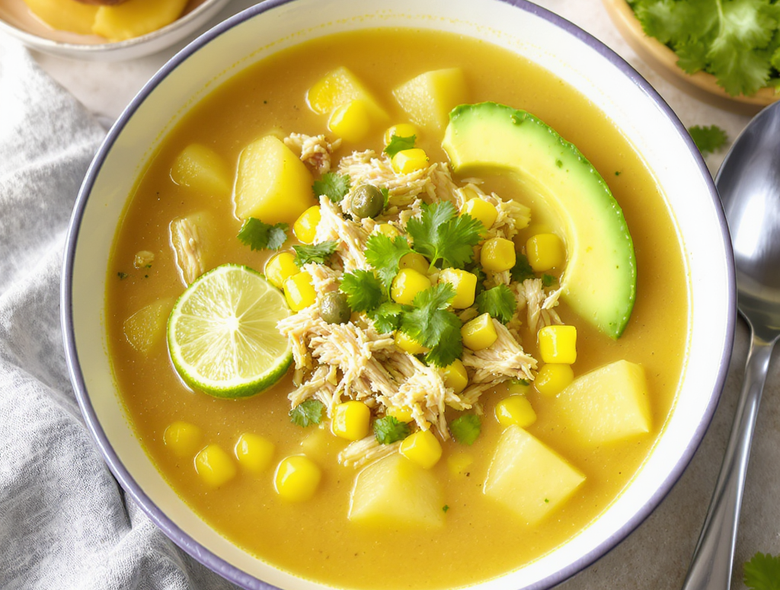 A simple Colombian-style chicken and potato soup with corn, lime, and avocado garnishes.