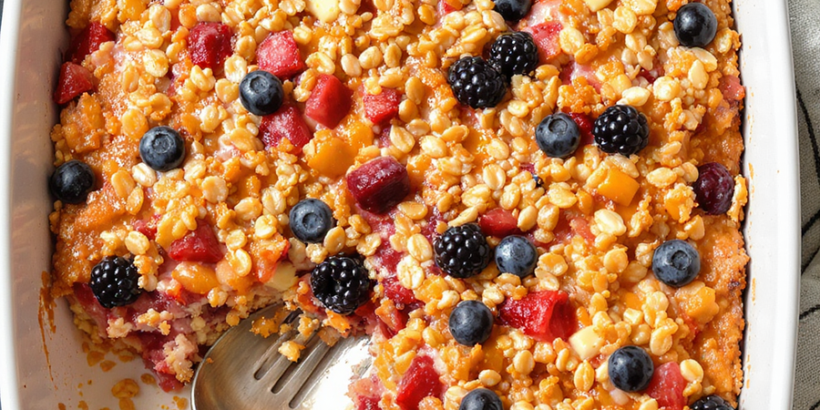 This Berry Baked Oatmeal is a simple, make-ahead breakfast casserole made with old-fashioned oats, warmed milk and eggs, maple syrup, butter, and mixed berries. It bakes into a golden, slightly chewy casserole that slices easily after resting and is great for family breakfasts or brunch.