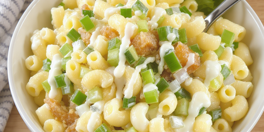 Elbow macaroni tossed with diced celery, green pepper and sweet onion, dressed with mayonnaise, a splash of vinegar and sweetener. Chill before serving so flavors meld.